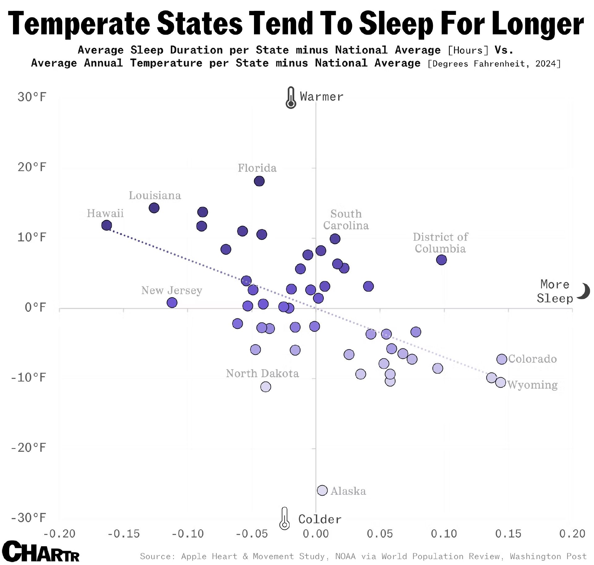 Plotting average sleep duration with each state’s deviation from the national mean temperature showed that warmer states — such as Louisiana, Texas, and Florida — trended with having shorter sleep lengths. Hawaii, known for its tropical climate, saw participants get the least sleep of any state at 6 hours and 31 minutes, despite having the earliest bedtime (11:06 p.m.).